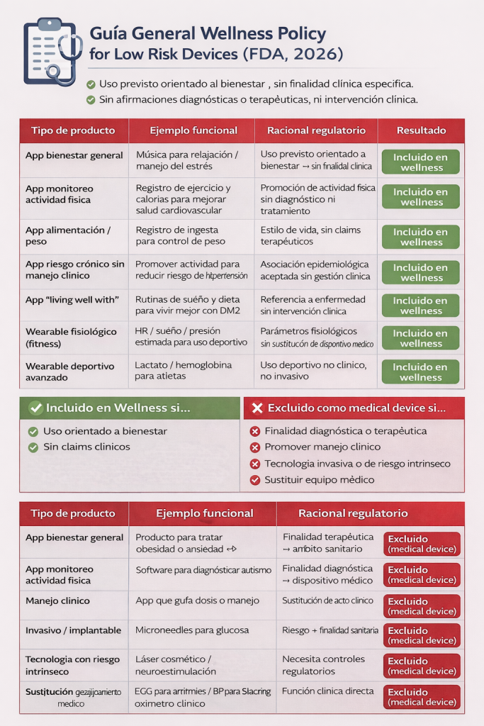 El 6 de enero de 2026 la Agencia Estadounidense Food and Drug Administration (FDA) publicó la actualización de la guía General Wellness: Policy for Low Risk Devices https://www.fda.gov/regulatory-information/search-fda-guidance-documents/general-wellness-policy-low-risk-devices, cuyo objetivo es clarificar los criterios bajo los cuales determinados productos orientados al bienestar general (general wellness products) pueden quedar fuera del alcance de la regulación aplicable a los dispositivos médicos (medical devices). La guía, -emitida por el Center for Devices and Radiological Health (CDRH) con la participación del Digital Health Center of Excellence (oficina creada por la FDA para coordinar las líneas regulatorias vinculadas a software, inteligencia artificial (IA) y dispositivos digitales (2)-, establece que la calificación que otorga la agencia, depende de dos factores centrales: el uso previsto (intended use) y el nivel de riesgo asociado. Entre “las novedades” de esta Guia, se destaca la posibilidad de que ciertos dispositivos con sensores fisiológicos —como wearables que estiman parámetros de salud— permanezcan fuera del ámbito sanitario regulado siempre que no realicen funciones diagnósticas, terapéuticas o de manejo clínico. Este artículo analiza la naturaleza jurídica, el contexto regulatorio y el impacto potencial de la Guía en el desarrollo de soluciones de bienestar digital, así como su posible influencia en otras jurisdicciones fuera de los Estados Unidos. Y discute las implicancias para el ecosistema latinoamericano, especialmente en relación con procesos de digitalización del cuidado y la telemedicina.